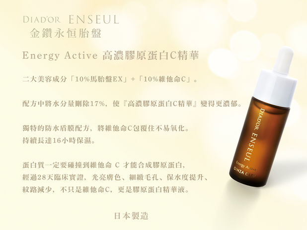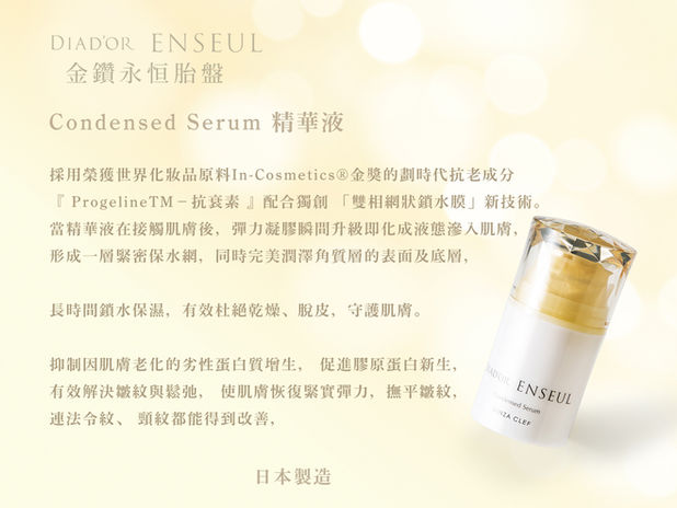 DIAD’OR ENSUEL擁有膠原蛋白所需的20種胺基酸,可以提升膠原蛋⽩! 令皮膚回復彈性、潔白、光彩、年輕,如鑽石般綻放光茫 ,耀眼迷人。