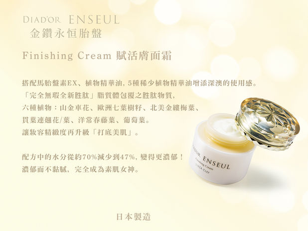 世界唯一只有 「DIAD`OR ENSEUL」 獨家添加 - 3 種來自紐西蘭的純種馬的頂級奢華美肌成分,以賦予肌膚生命力的『馬胎盤萃取EX 金鑽精華』為首,另添加『馬臍帶精華』與『馬由來賽洛美(神經醯胺)』,能迅速滲透水分,為乾燥肌膚補充豐富滋潤;配合微粒膠原蛋白與3 種玻尿酸的獨特技術,完整幫助肌膚補充與鎖住水分。